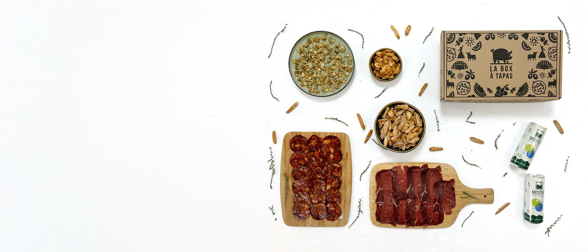 La cecina de León, fumée au bois de chêne, dévoile toute la profondeur de ses arômes. À ses côtés, le chorizo de bellota de Guijuelo offre une intensité rare, à la fois douce et fumée. Les amandes au romarin, grillées à la main, apportent une note méditerranéenne et croquante, rappelant la simplicité élégante des bons produits. Chaque saveur trouve sa place, chaque bouchée raconte un paysage.